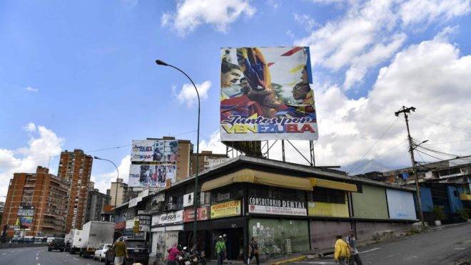 Em 02 de maio de 2019, documentos revelam a ligação de um ministro de Maduro com o Hezbollah e o narcotráfico. Enquanto Caracas mergulha no colapso, membros do regime chavista enriquecem com atividades criminosas. A imagem de Maduro em Petare simboliza poder e impunidade em meio ao caos. (Foto: Yuri Cortez / AFP)